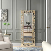Dramatic, antiqued style meets a glam feel in this full-length mirror. Designed to lean against your wall or mount directly on it, this distinctive piece features an ornate scrolling filigree frame with scrolling accents and botanical motifs. We love that its distressed white and gold finish adds a vintage-inspired look. The mirror measures 68'' high and 27'' wide, so it captures your entire reflection, just right for selfies. We love that it can reflect light from outside around your room, making your space feel bigger and brighter.